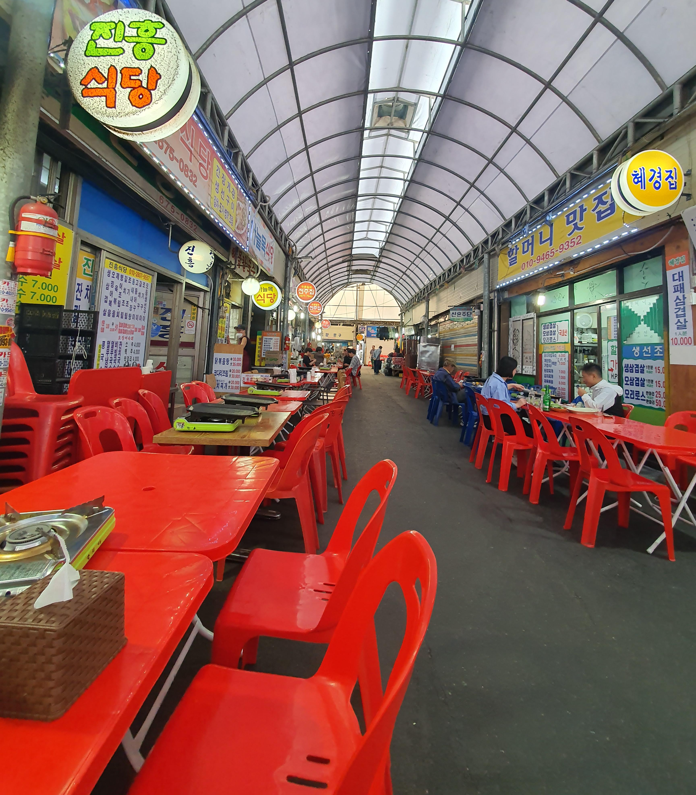 시장 골목에 테이블이 쭉 나열된 것을 보고 어마어마한 곳인가 보다 싶어서 낮 술자리를 이곳으로 선택했습니다.