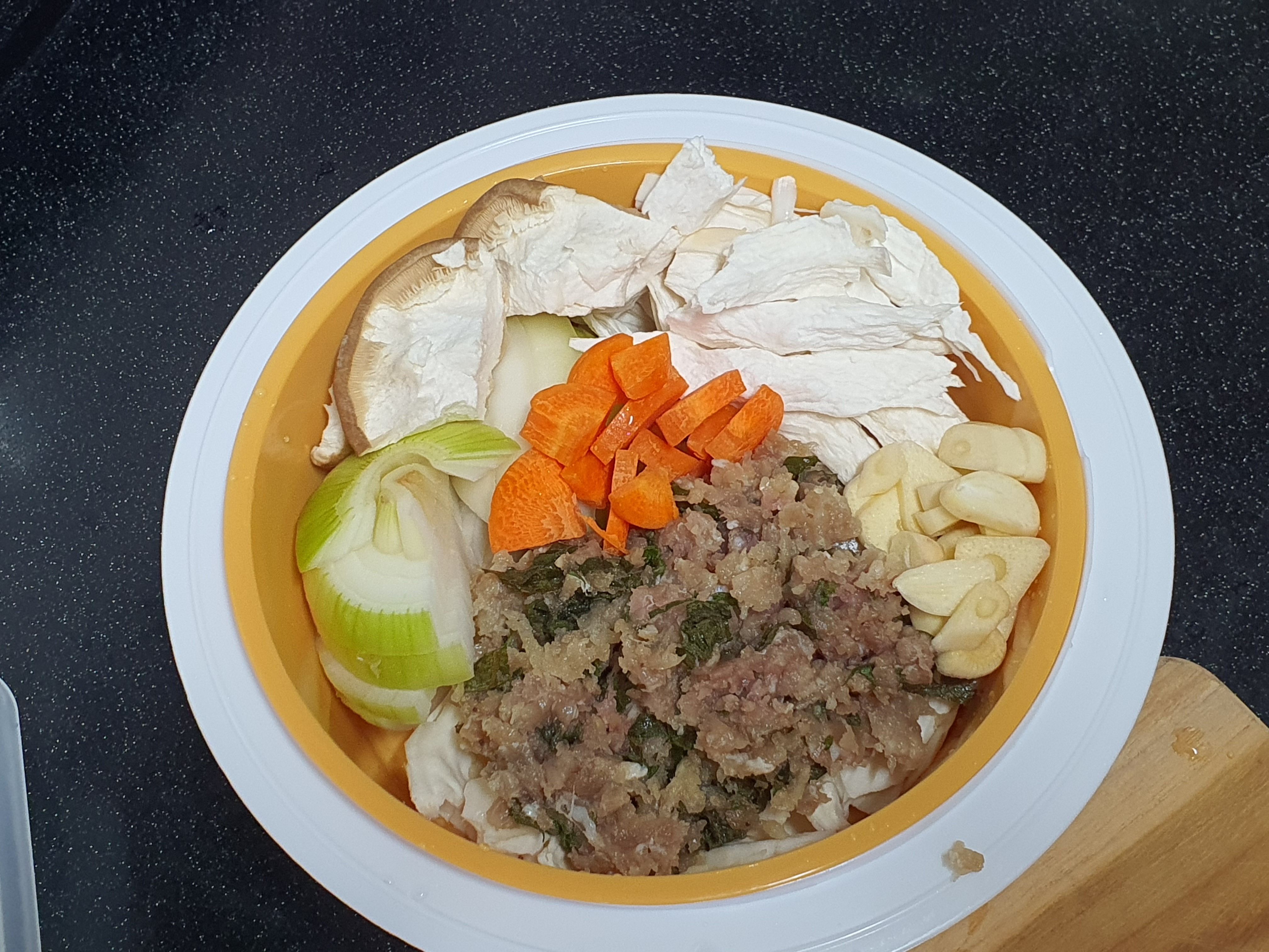 하얀색 통에 물을 좀 담아두고, 이 노란색 통에 음식을 담고 전자레인지에 넣으면 됩니다.