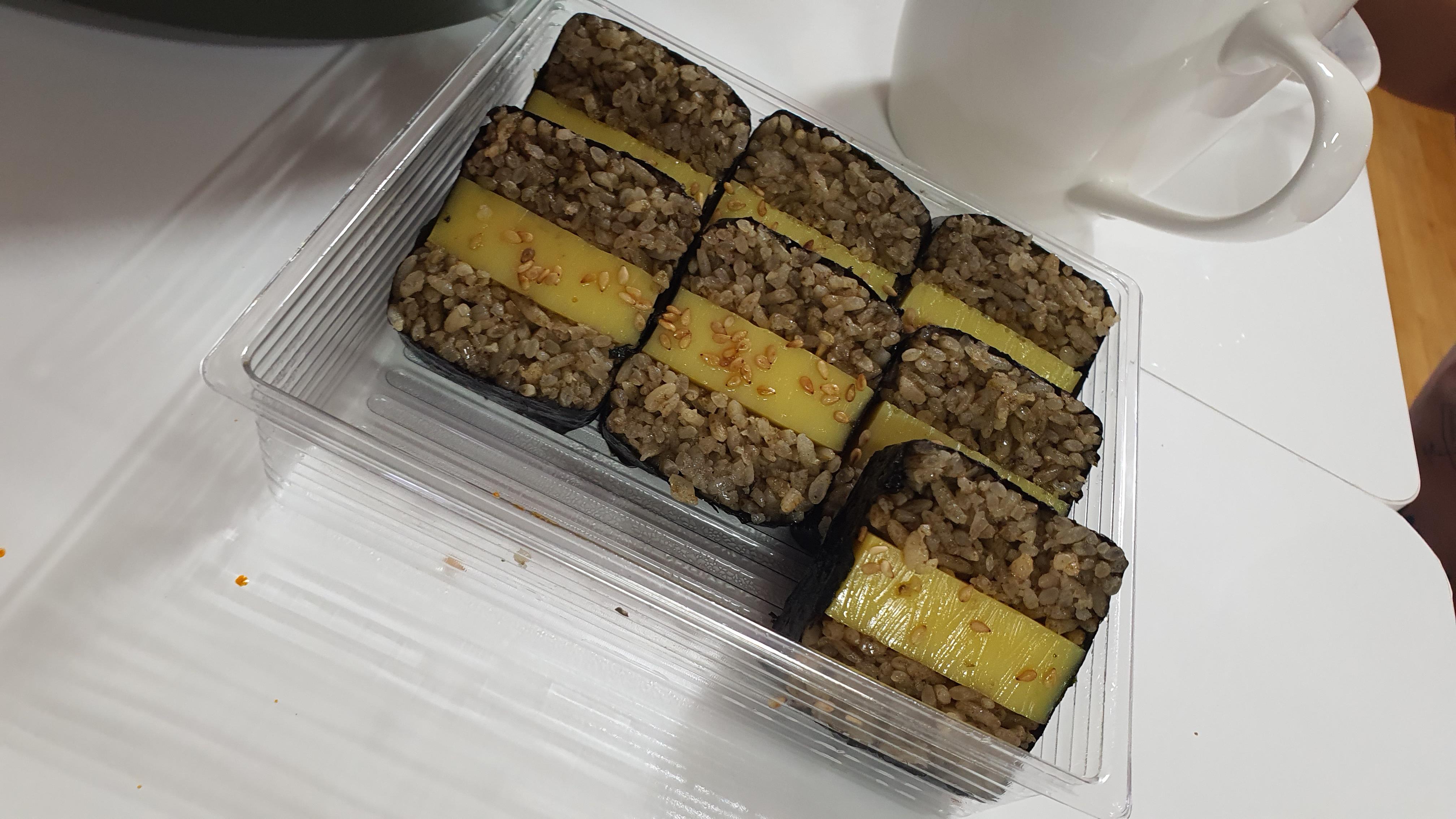가운데 노란 김밥은 젤라틴을 넣은 건지(?) 탱글 탱글한 식감을 가진고 있어요. 매력 있어요.