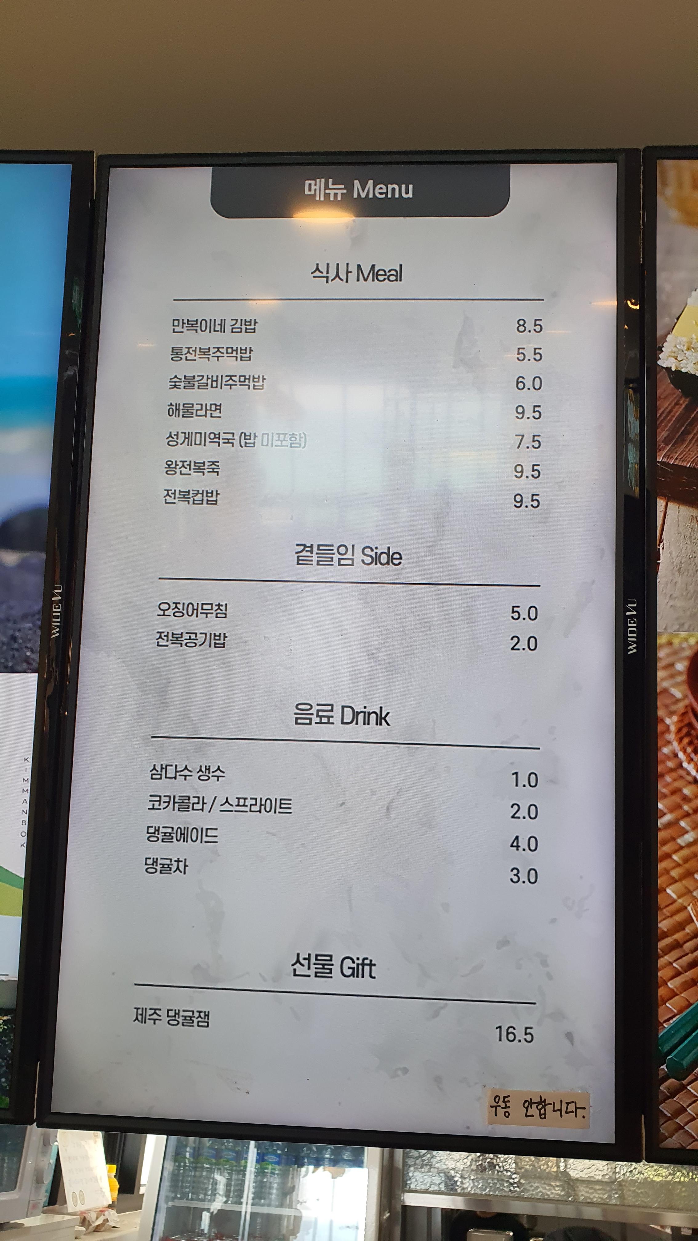 만복이네 김밥, 통전복주먹밥, 숯불갈비주먹밥 , 해물라면, 성게미역국(밥 미포함), 왕전복죽, 전복김밥, 오징어무침, 전복공기밥, 댕귤에이드, 댕귤차, 제주 댕귤쨈.