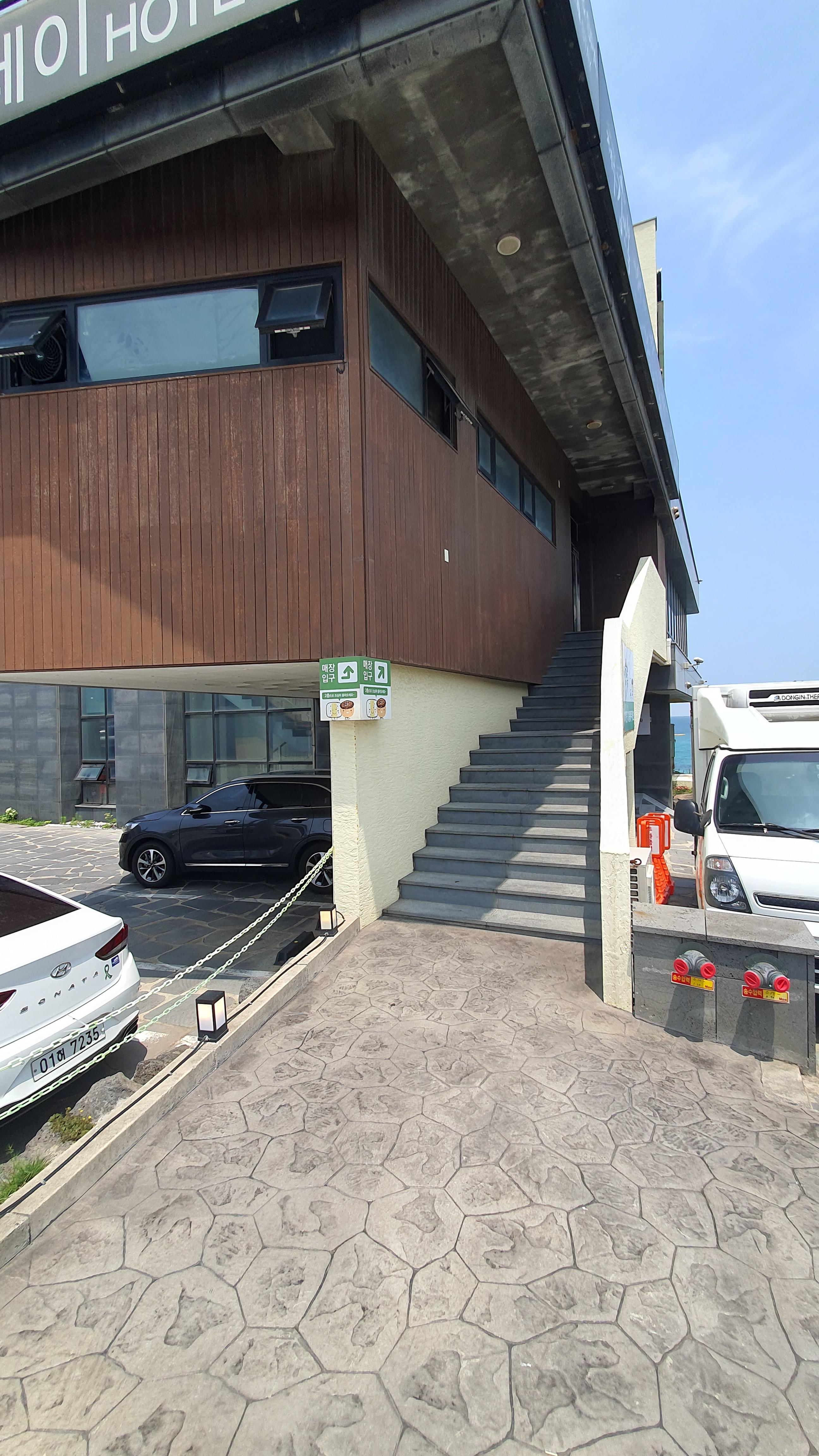 이 카페 건물 옆에 주차를 하고 , 어머니는 카페 안에서 음료를 드시면서 쉬셨어요.