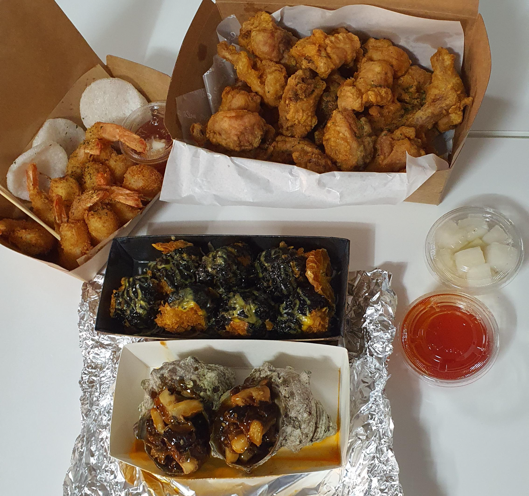 바삭바삭 새우 코코넛 튀김, 뿔소라 버터구이, 후라이드 치킨, 수제 흑돼지 강정.