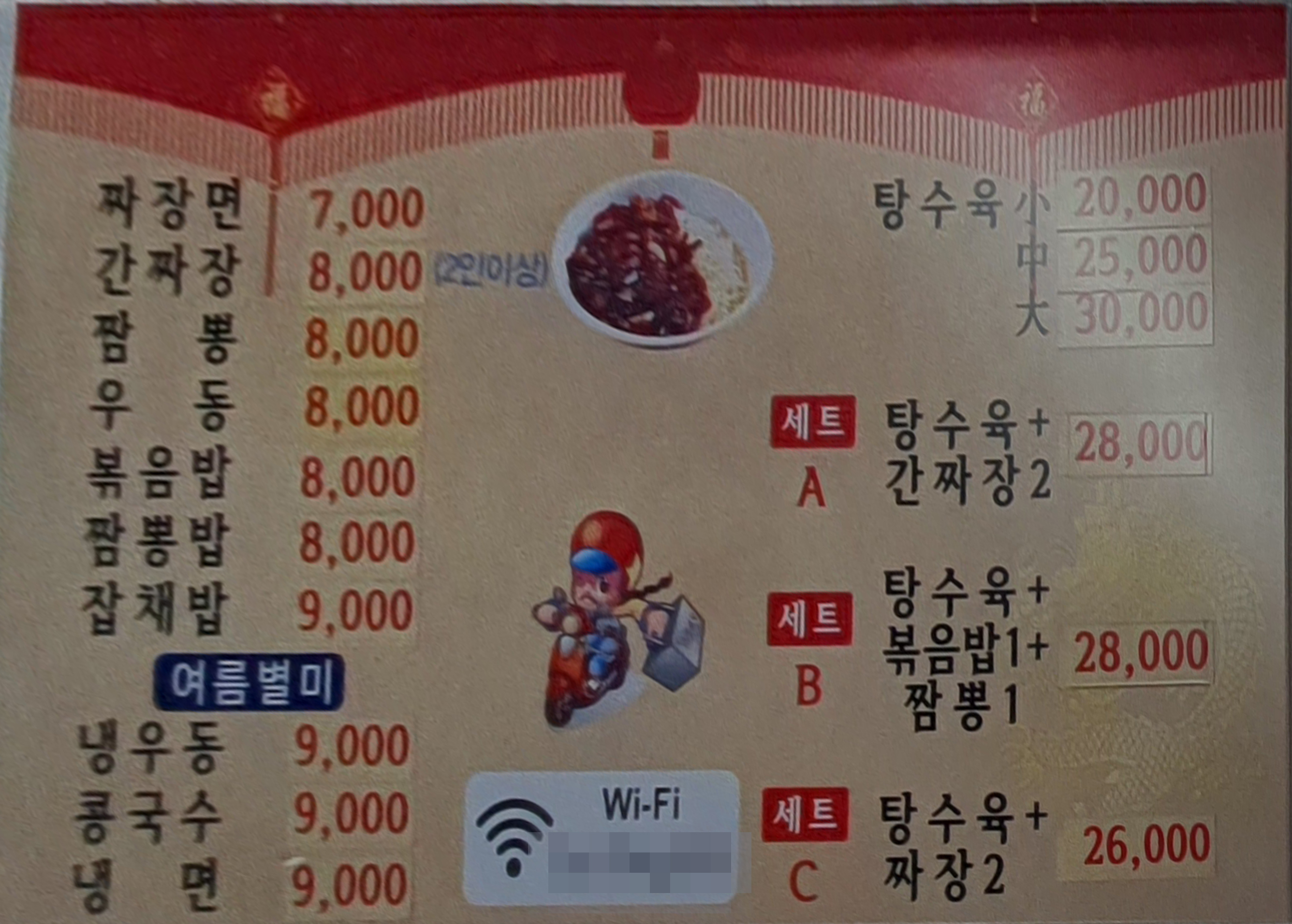 짜장면, 간짜장, 짬뽕, 우동, 볶음밥, 짬뽕밥, 잡채밥, 냉우동, 콩국수, 냉면, 탕수육.