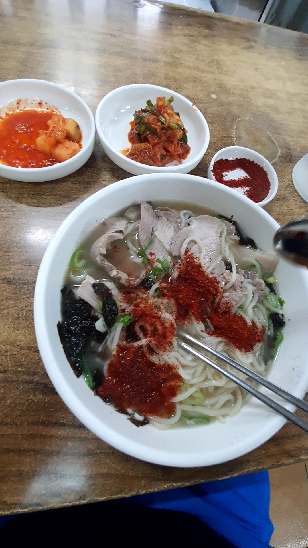 고추가루를 넣는 순간 육지에서 먹던 익숙한 느낌의 국수가 되어 버린 거 같아요.