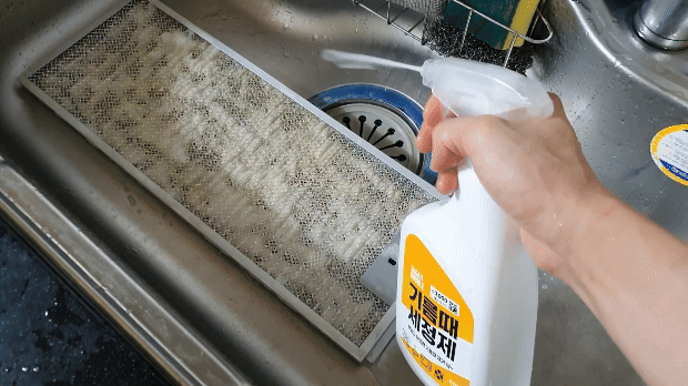렌지후드 필터를 꺼내서 거품 용액을 골고루 뿌려줬어요.