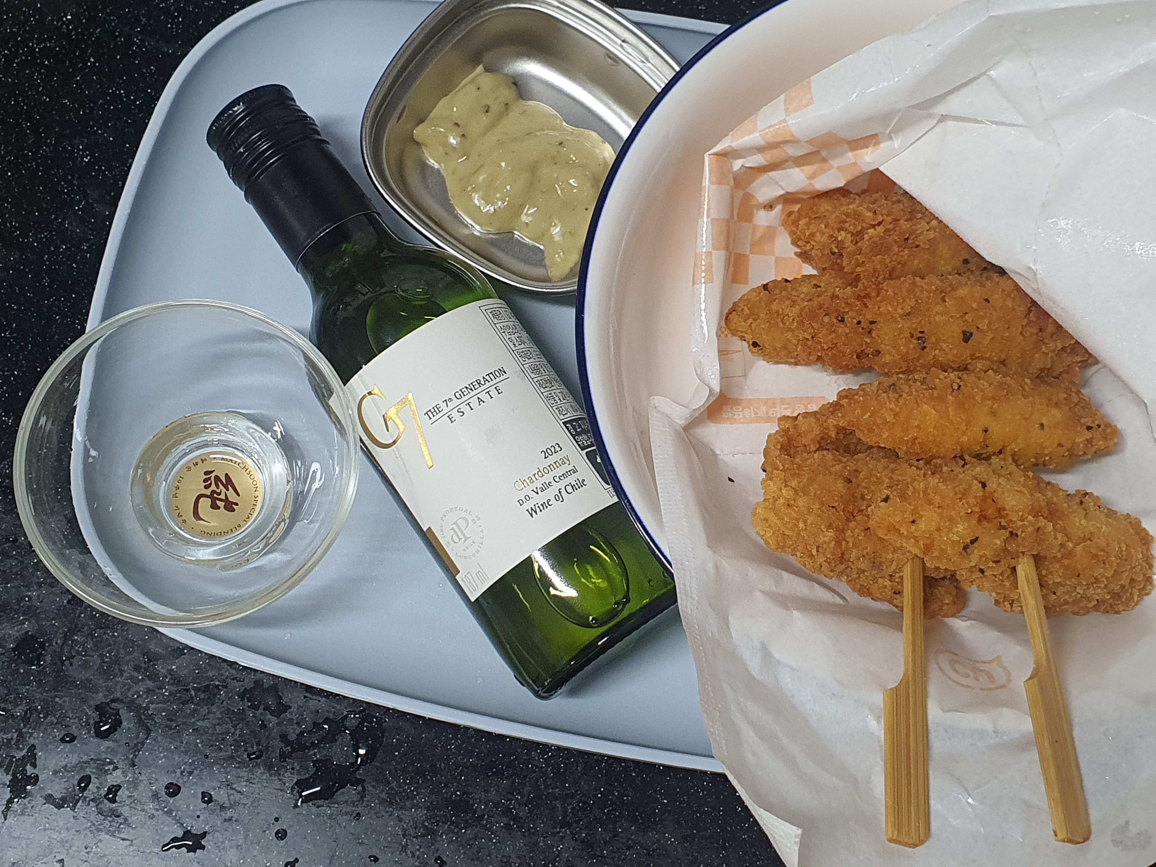 근데 화이트와인과 치킨텐더(+크림와사비소스) 조화는 나쁘지 않았어요.