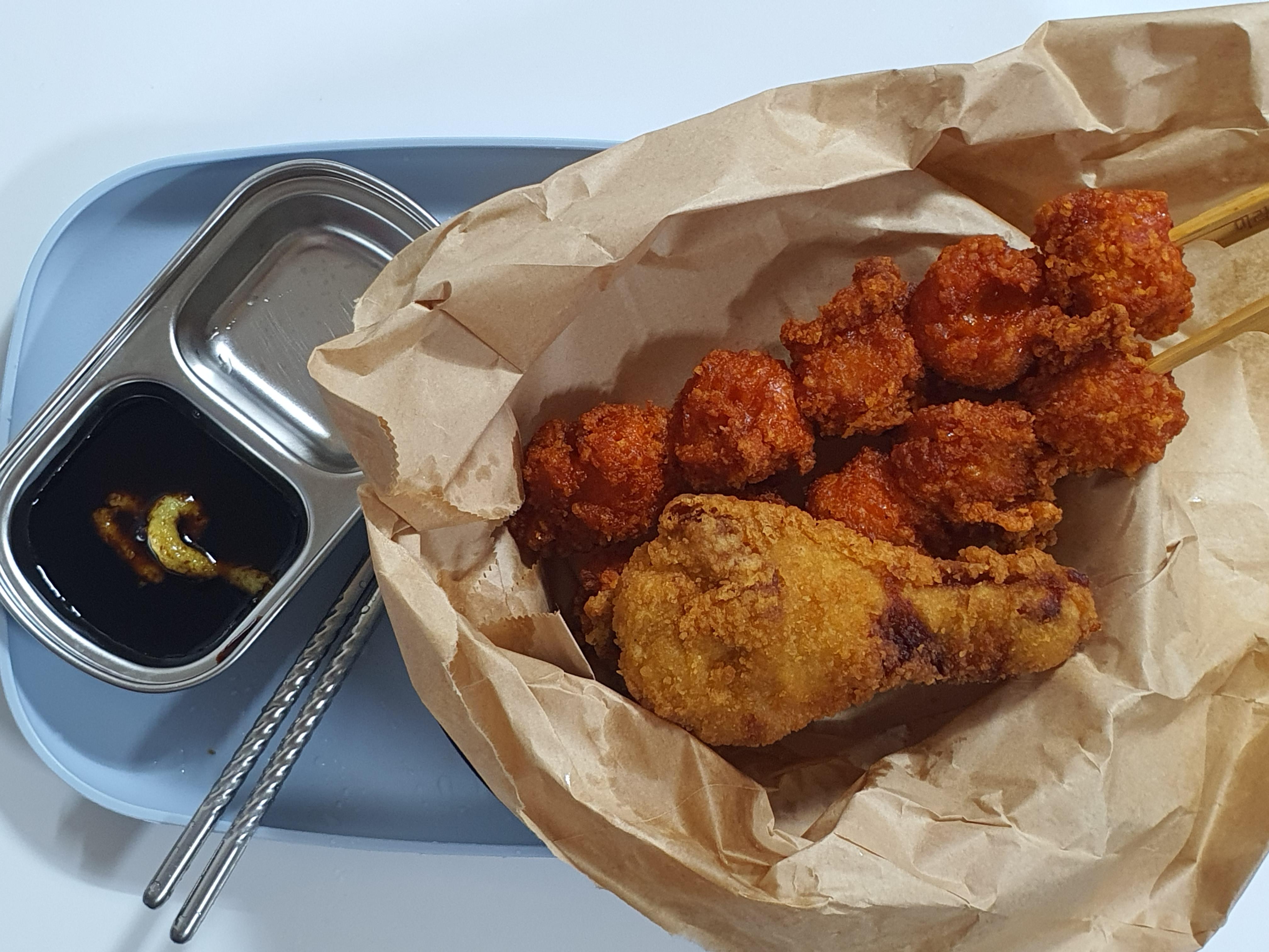 그래서 편의점에서 닭다리, 치킨팝콘꼬치(튀김닭꼬치) 사 왔어요.