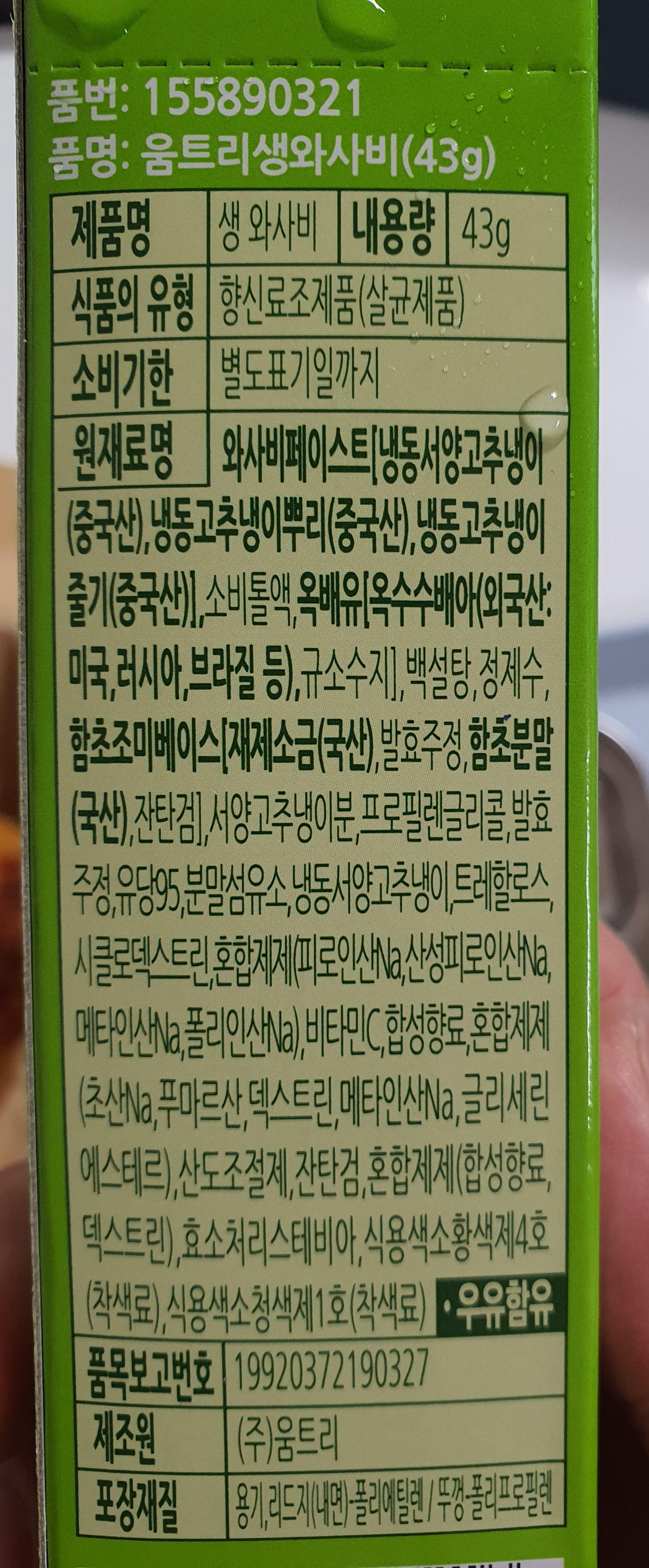 와사비페이스트[냉동서양고추냉이(중국산),냉동고추냉이뿌리(중국산), 냉동고추냉 줄기(중국산)], 소비톨액, 옥배유[옥수수배아(외국산: 미국, 러시아, 브라질 등), 규소수지], 백설탕, 정제수 , 함초조미베이스(재제소금(국산), 발효주정, 함초분말 (국산),잔탄검], 서양고추냉이분, 프로필렌글리콜, 발효 주정, 유당95,분말섬유소, 냉동서양고추냉이, 트레할로스, 시클로덱스트린, 혼합제제(피로인산Na, 산성피로인산Na, 메타인산Na, 폴리인산Na), 비타민C, 합성향료, 혼합제제 (초산Na, 푸마르산, 덱스트린, 메타인산Na, 글리세린 에스테르),산도조절제,잔탄검,혼합제제(합성향료, 덱스트린), 효소처리스테비아, 식용색소황색제4호 (착색료), 식용색소청색제1호(착색료)
