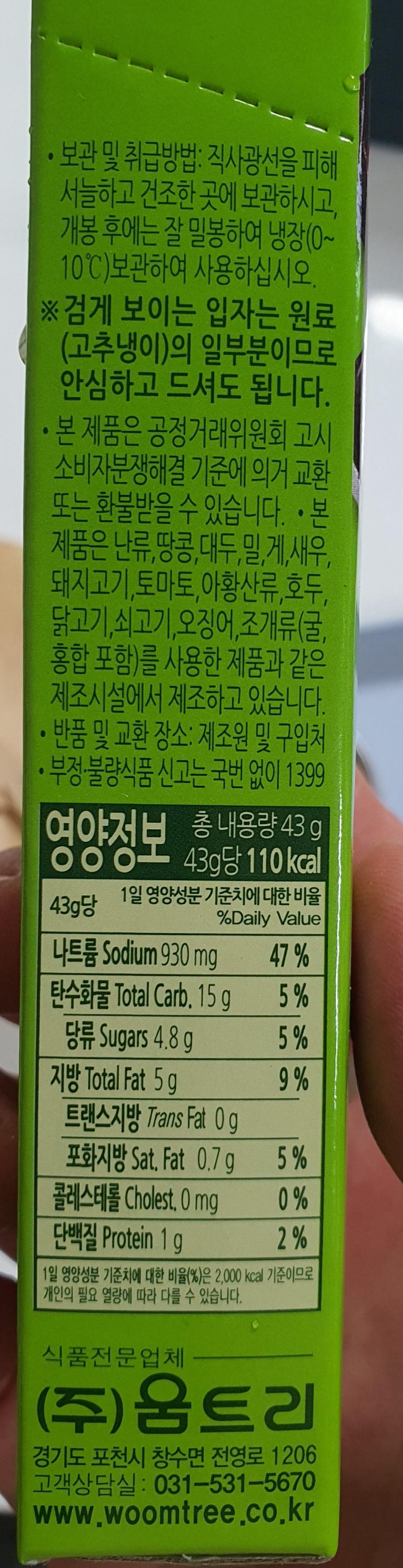 •보관 및 취급방법: 직사광선을 피해 서늘하고 건조한 곳에 보관하시고, 개봉 후에는 잘 밀봉하여 냉장(0~ 10°C)보관하여 사용하십시오 ※검게 보이는 입자는 원료 (고추냉이)의 일부분이므로 안심하고 드셔도 됩니다. 본 제품은 공정거래위원회 고시 소비자분쟁해결 기준에 의거 교환 또는 환불받을 수 있습니다. • 본 제품은 난류,땅콩,대두,밀,게,새우, 돼지고기, 토마토, 아황산류,호두, 닭고기, 쇠고기, 오징어, 조개류(굴, 홍합 포함)를 사용한 제품과 같은 제조시설에서 제조하고 있습니다.