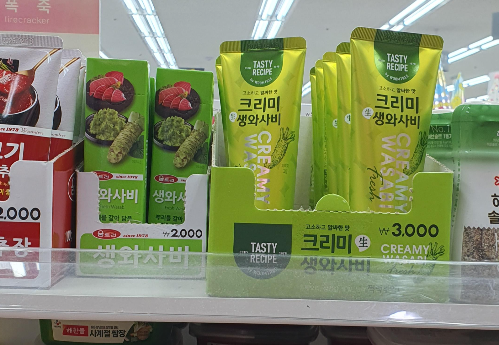 다이소 식품 진열칸을 보면 생와사비와 크리미 와사비도 팔고 있어요.