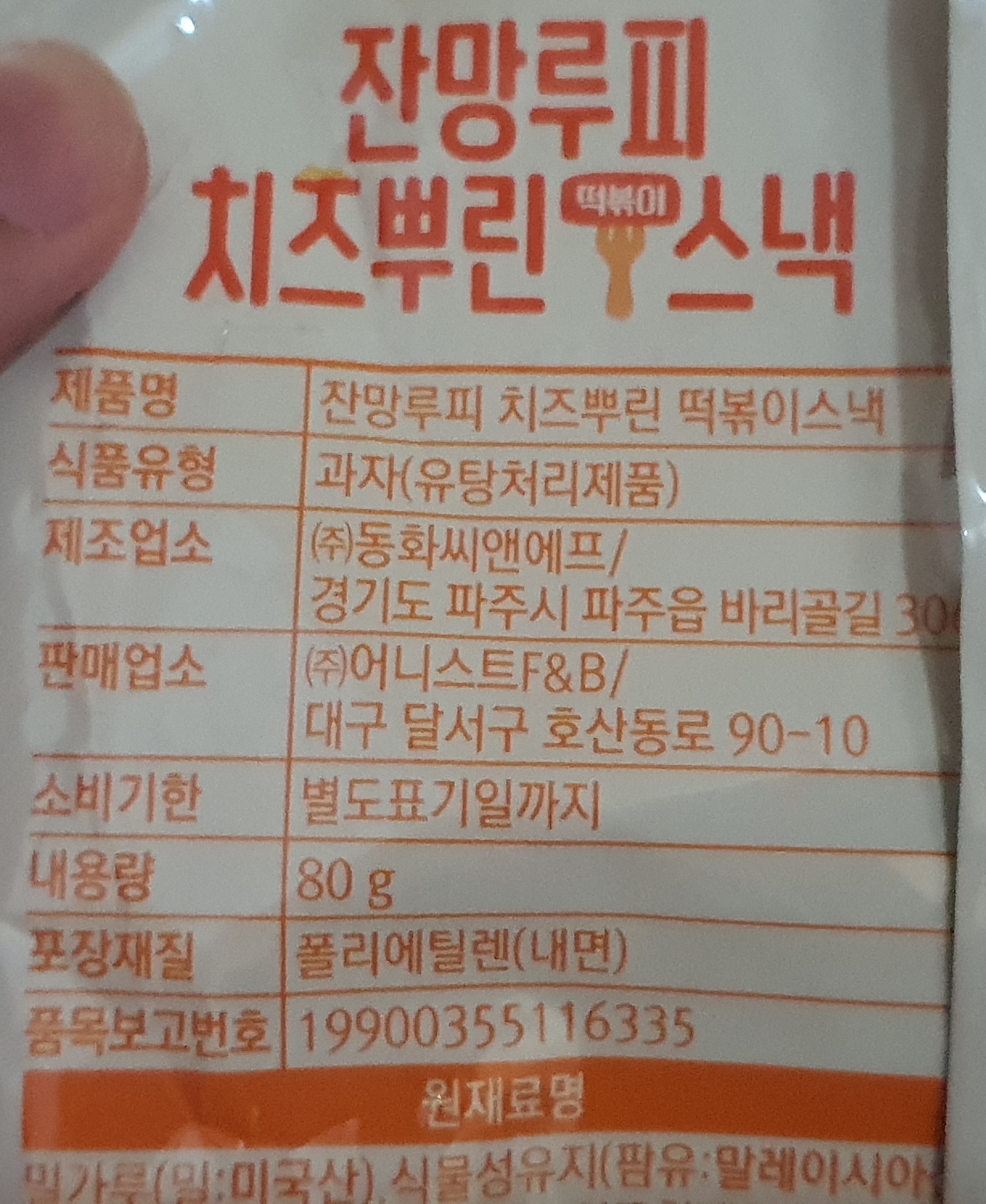 제품명 잔망루피 치즈뿌린 떡볶이스낵