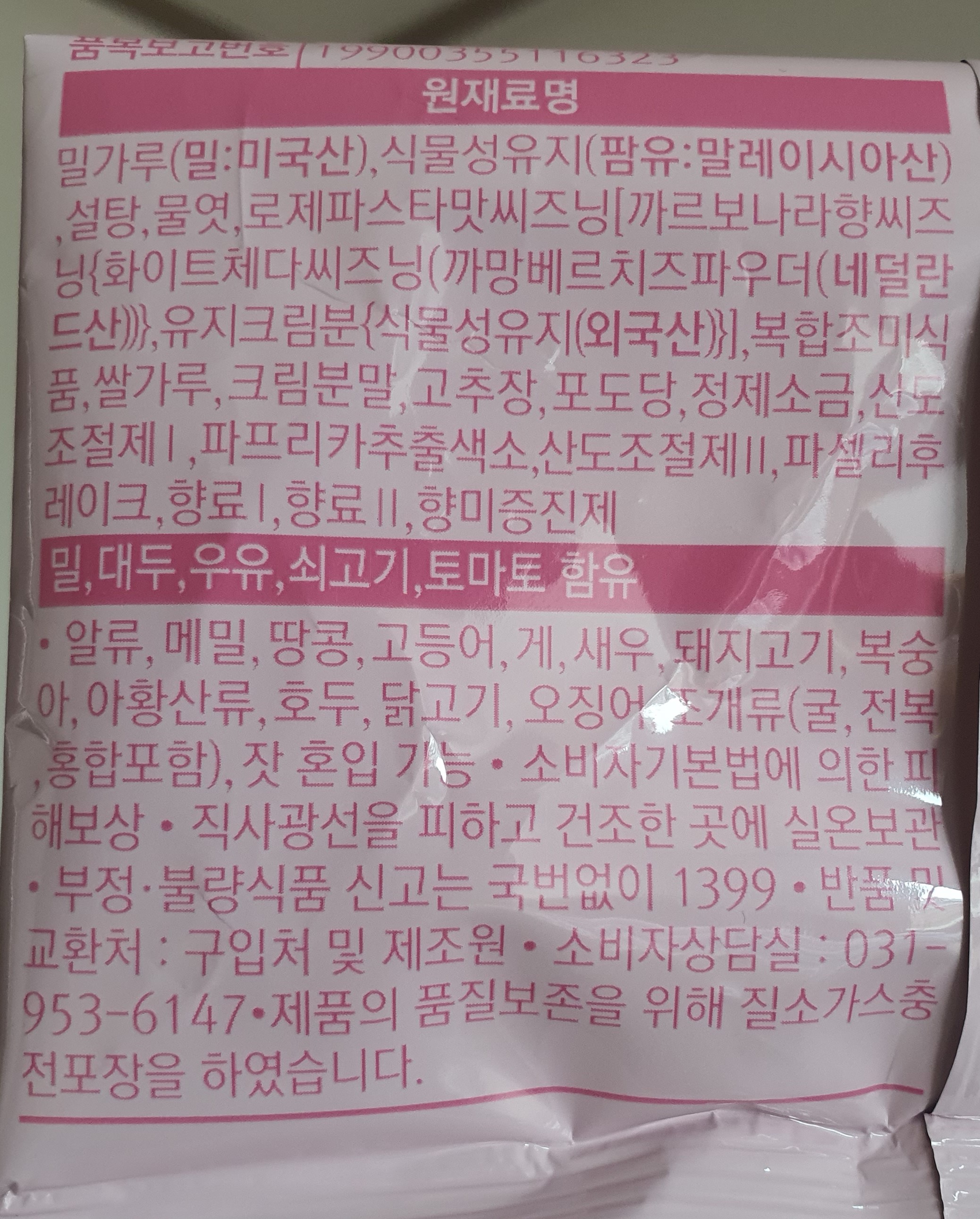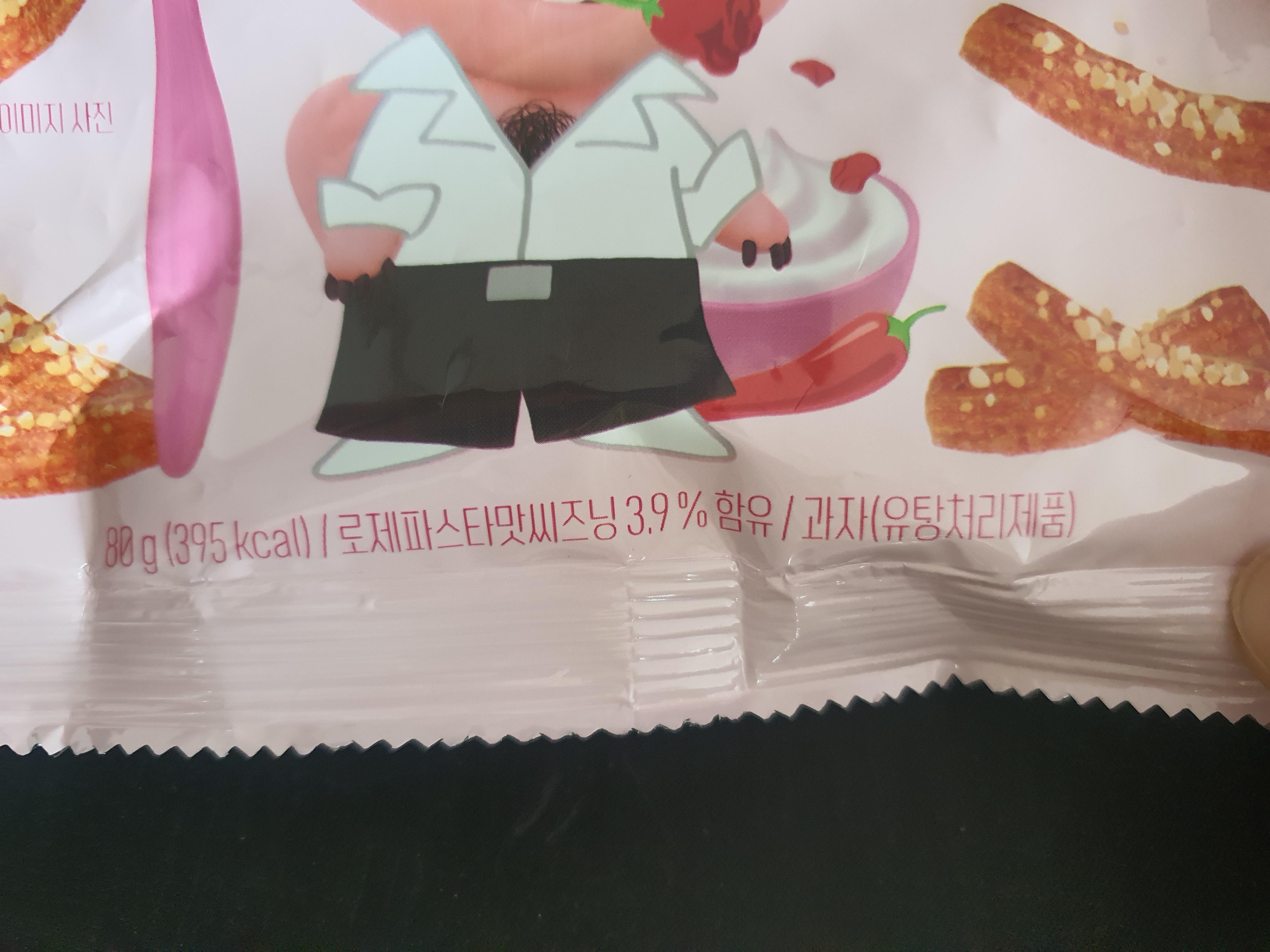 밀가루(밀:미국산), 식물성유지(팜유:말레이시아산) 설탕,물엿,로제파스타맛씨즈닝[까르보나라향씨즈 닝{화이트체다씨즈닝(까망베르치즈파우더(네덜란 드산),유지크림분(식물성유지(외국산)}],복합조미식 품,쌀가루, 크림분말,고추장,포도당,정제소금,신도 조절제, 파프리카추출색소,산도조절제II, 파셀리후 레이크,향료,향료 ||, 향미증진제.