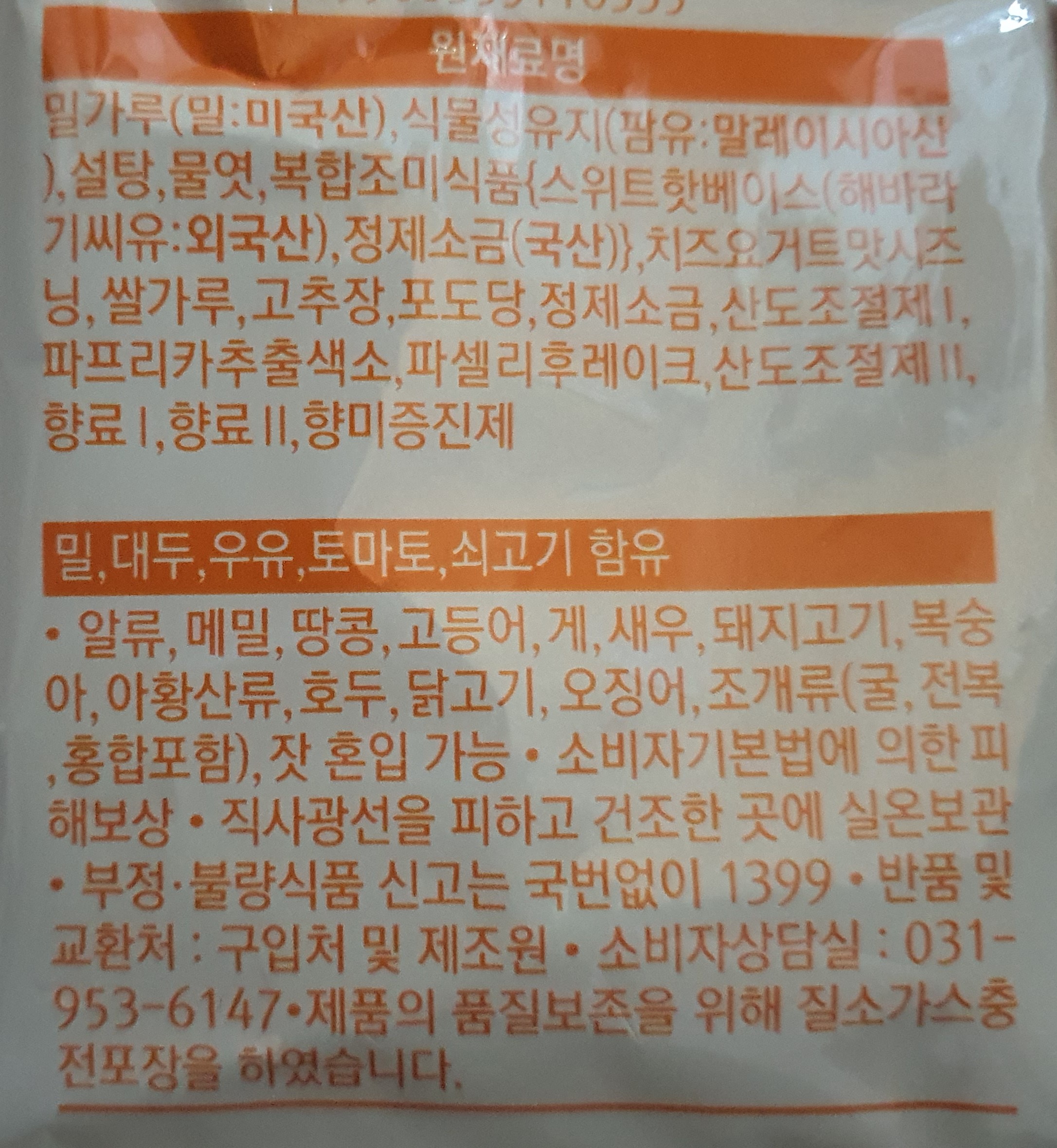 알류, 메밀, 땅콩, 고등어, 게, 새우, 돼지고기, 복숭 아, 아황산류, 호두, 닭고기, 오징어, 조개류(굴,전복 ,홍합포함), 잣 혼입 가능.