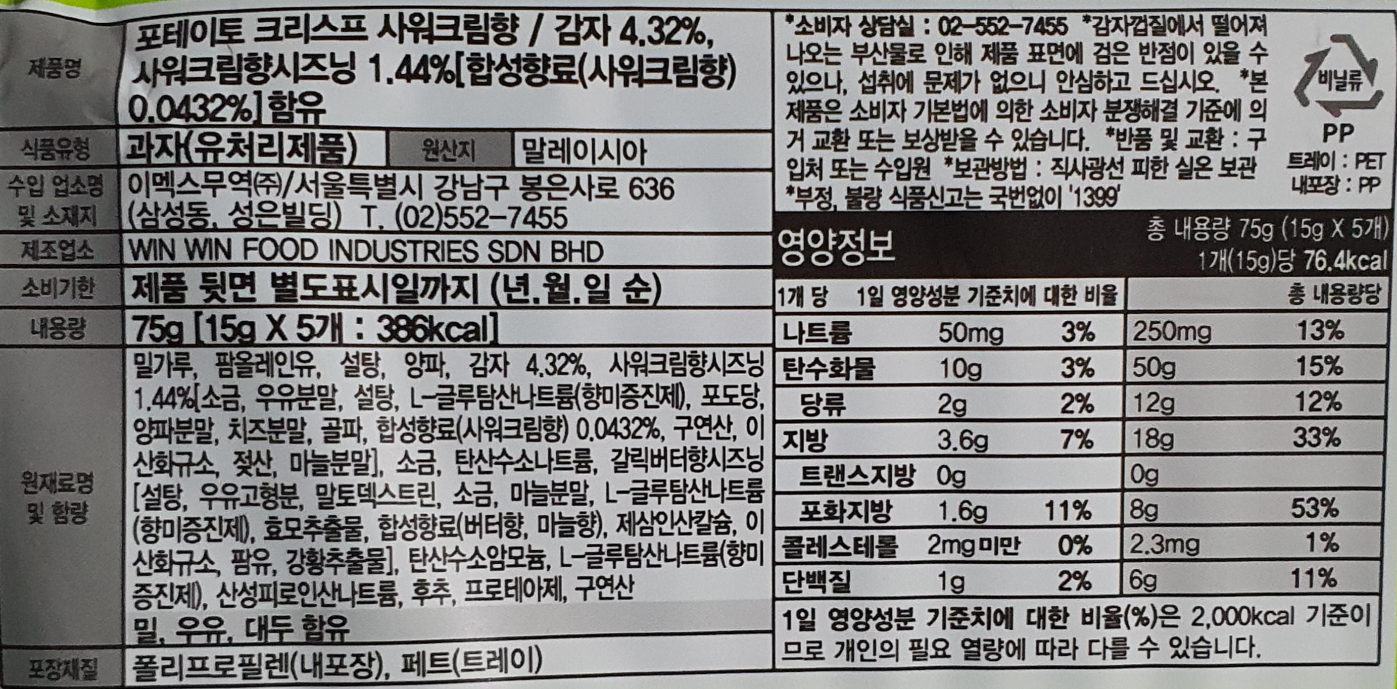 감자 4.32%, 사워크림향시즈닝 1.44% [합성향료(사워크림향) 0.0432%] 함유.
